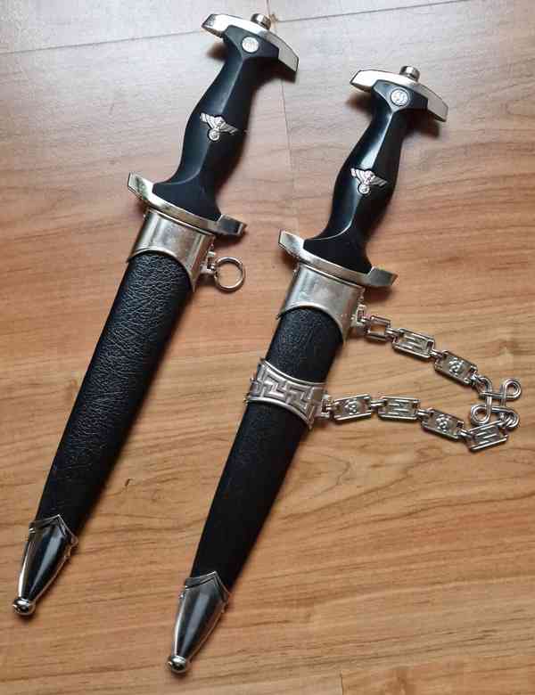 Prodám sběratelům válečných věcí tuto repliku německé dýky pro jednotky SS.Při dneštních cenách originálních kousků,je tato cenově dostupná varianta rozumným řešením a dýka určitě ve sbírce neudělá ostudu a je moc pěkná ve vitrýnce.Stav je jako nová.Nápis na čepeli Meine Ehre Heist Treue - Mou ctí je věrnost. Zezadu značení RZM.Třeba se někomu hodí do sbírky.Mám v nabídce dva druhy,řetězovou verzi pro vyšší důstojníky ss a bez řetězu pro nižší důstojnictvo a vojáky ss.Vyberte si jaká se líbí.Možno obě, nebo jednotlivě dle výběru.