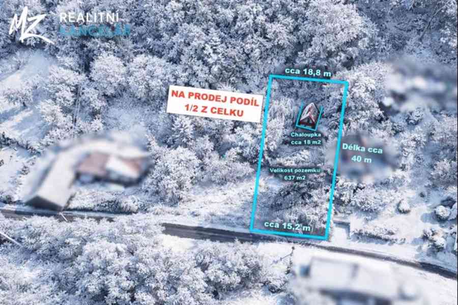 Na pozemku stojí zděná, patrová chatka s podsklepením a zastavěnou plochou 18 m², která poskytne zázemí pro víkendový pobyt nebo přespání. K pozemku vede zpevněná cesta a v sousedství již probíhá výstavba menšího rodinného domu, což zvyšuje potenciál lokality do budoucna.