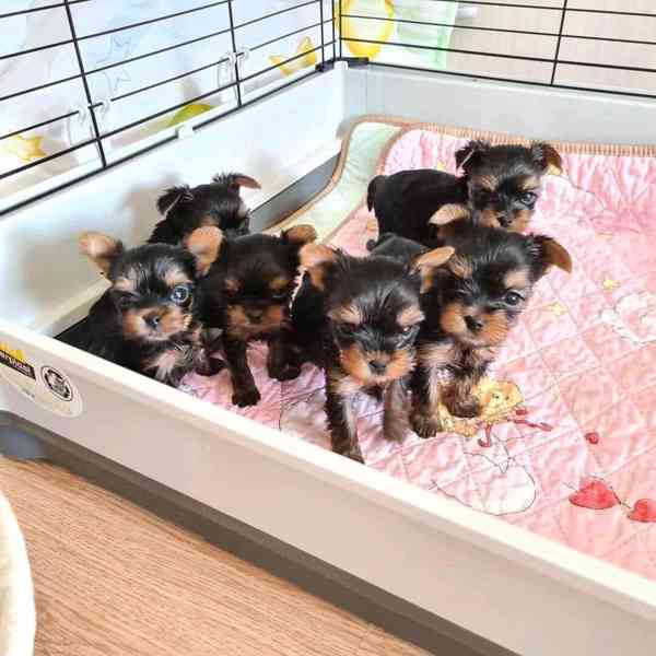 Prodám čtyři rozkošná štěňátka jorkšírského teriéra (kluci a holčičky). Mají zdravotní prohlídku, první očkování a jsou čipovaní. Krásná zdravá a aktivní štěňátka. Vycvičený k čůrání na podložky pro štěně. V případě zájmu prosím pošlete zprávu. Děkuji