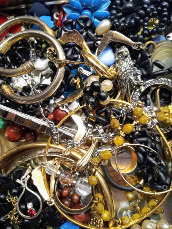 Krabice staré bižuterie z pozůstalosti - náhrdelníky, sponky, náramky, náušnice, přívěsky, příruční lupa v ozdobném rámečku se sovou, a spousta dalších věcí. Praha 2, nebo možnost poslat zásilkovnou za 89.-Kč.