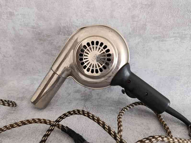 Starý značkový fén AEG – chromovaný kov, textilní kabel, krásný sběratelský stav