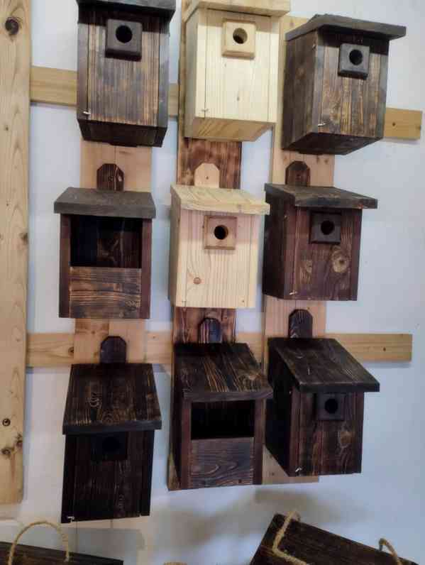 Prodej ptačích budek a krmitek v rustikálním stylu.