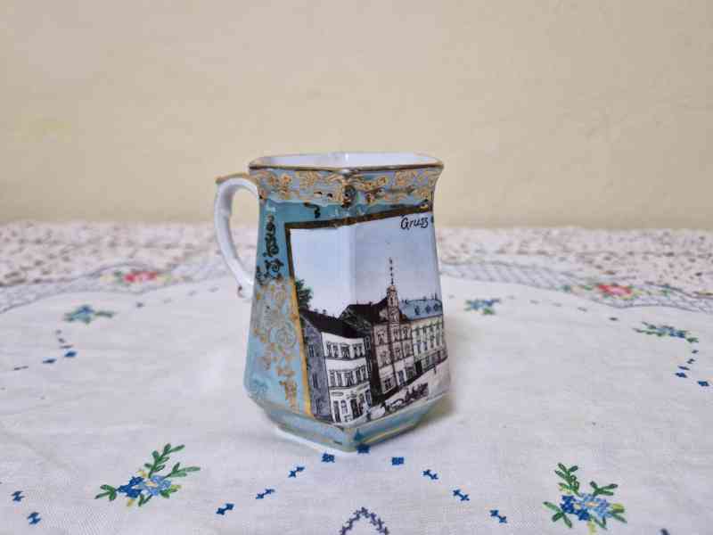 Vzácný starý Hrnek, domalovaný tisk, zlacení, Vejprty, Čechy 19/20 stol.