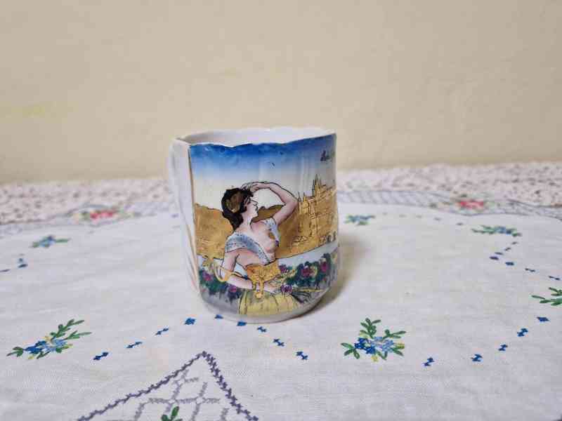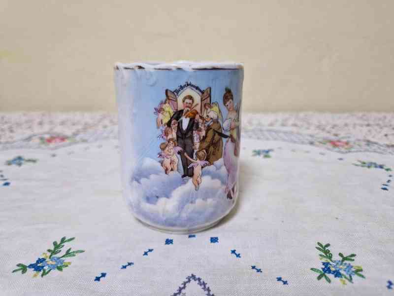 Vzácný ručně malovaný Hrnek, Johann Strauss mladší, svatební? Čechy nebo Rakousko, poslední třetina 19 stol.