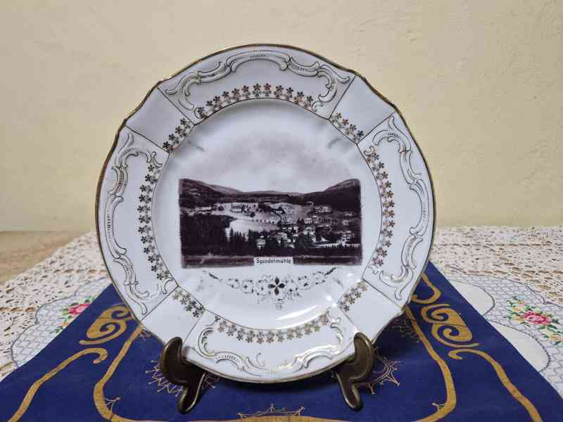 Krásný zlacený dekorační Talíř, Špindlerův Mlýn, značeno vtlačeným písmem, Čechy konec 19 stol.