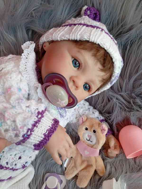 Panenka je příjemně měkká, krásně polohovací, mazlící, vlásky česací, má 2x dudlík na magnet, lahvičku, medvidka, rodný list na vyplnění.