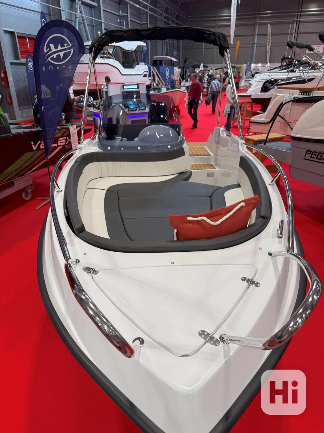 Loď je vybavena dvoubarevnými matracemi, piké - Vinylpex white/ carbon, krycí plachtou - černá, bimini - černé, koupací platformy na zádi lodi, schůdky do vody.
